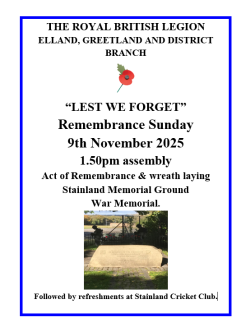 The Act of Remembrance and wreath laying ceremony will take place at the War Memorial, followed by refreshments at Stainland Cricket Club.